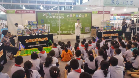 全国科普日江苏主场活动现场,不仅有苏台(江苏、台湾)两地科普书展,还有来自台湾元智大学的科学老师现场上了一堂科学公开课《空气现形记》,并且邀请了南京致远外国语小学二年级(1)班和四年级(2)班的学生来到现场体验了这堂生动有趣的科学课。台湾元智大学科学公开课通过科普秀进行展示,活动是由若干个科普实验组成,表演能够将深奥的科学用一些简单的器材展示给学生观看,生动活泼,引人入胜,极具创意。科普秀现场利用大屁股吹风机,与学生互动,从玩乐中学习空气原理--(伯努力定律),经由漂亮的干冰秀,运用活泼与生动的方式认识干冰,并且让学生引发对科学的兴趣,了解生活中的科学。
