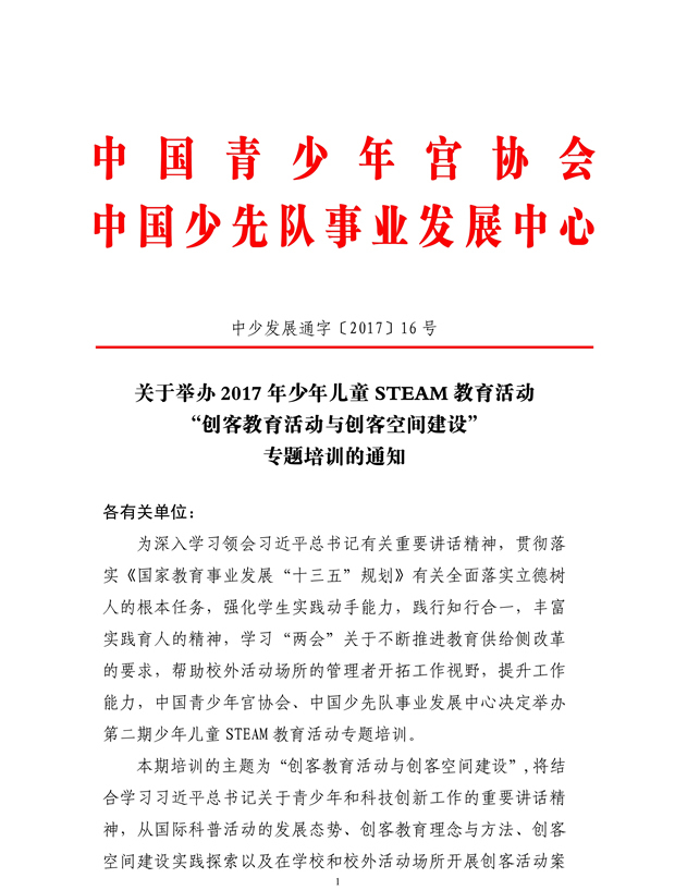 关于举办2017年少年儿童STEAM教育活动“创客教育活动与创客空间建设”专题培训的通知