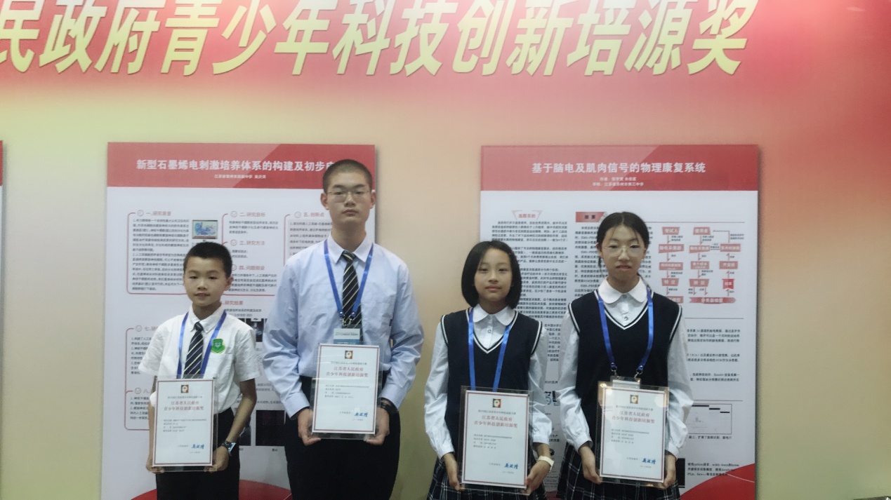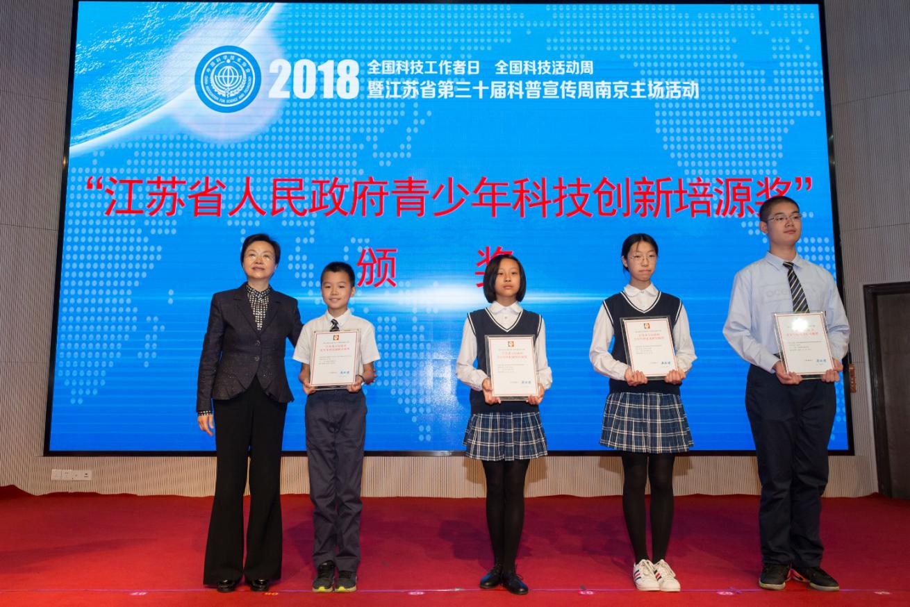 “江苏省人民政府青少年科技创新培源奖”是由江苏省人民政府设立的青少年科技创新方面的最高奖项,也是江苏省青少年科技创新大赛的最高奖项。根据大赛章程和《江苏省人民政府青少年科技创新培源奖评审办法》,在获得第29届江苏省青少年科技创新大赛一等奖项目中,评委会专家通过审阅材料、封闭答辩、二次查新等环节对各提名项目进行了综合评定,讨论确定了3名获奖建议名单。经省政府批准,正式授予陈一鸣、张宇荧和朱佳茗、吴沂灵四名同学获得2018年江苏省人民政府青少年科技创新培源奖,获奖选手获得省长吴政隆亲笔签名的证书及3000元奖金用于项目的后续研究。